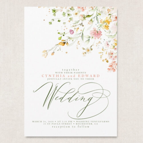 Some wildflower invitations feel rustic and relaxed while others are elegant and refined. Consider whether your wedding theme is vintage, boho, modern, or romantic when selecting the right design.